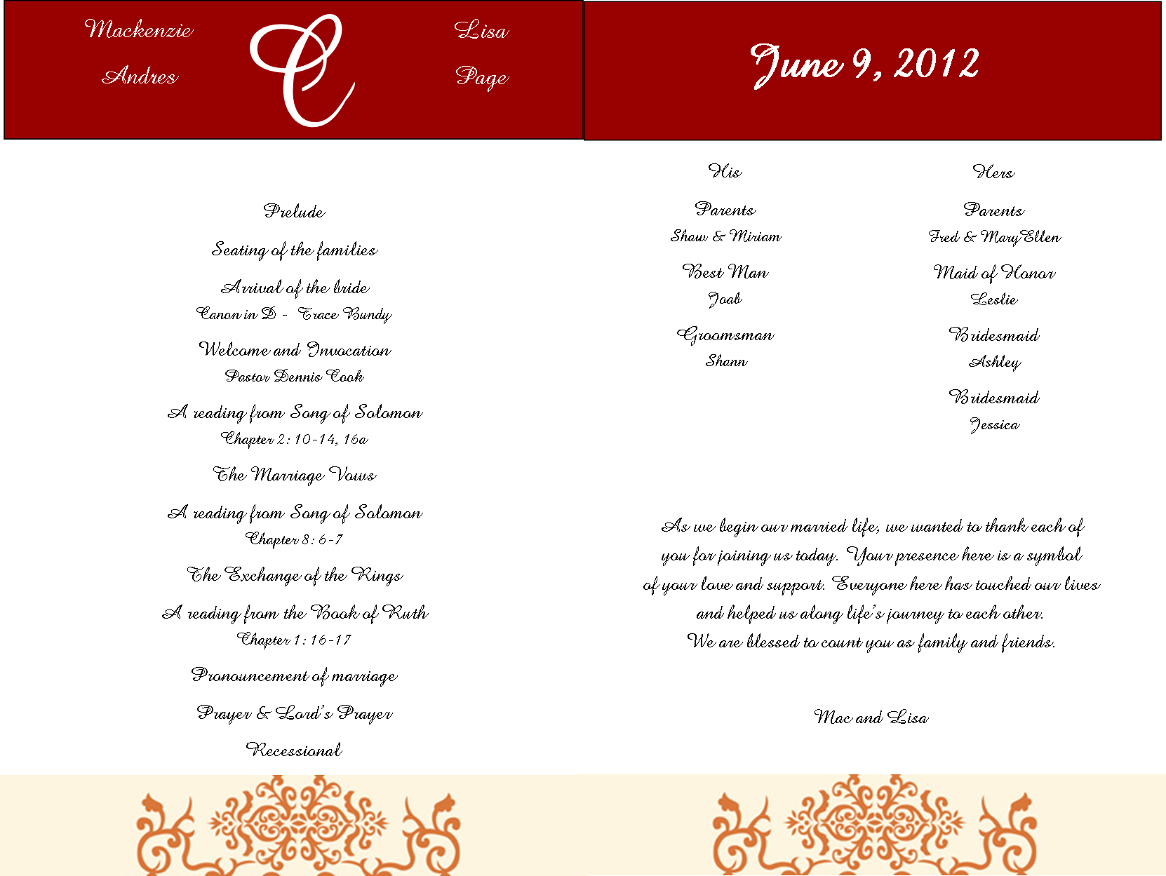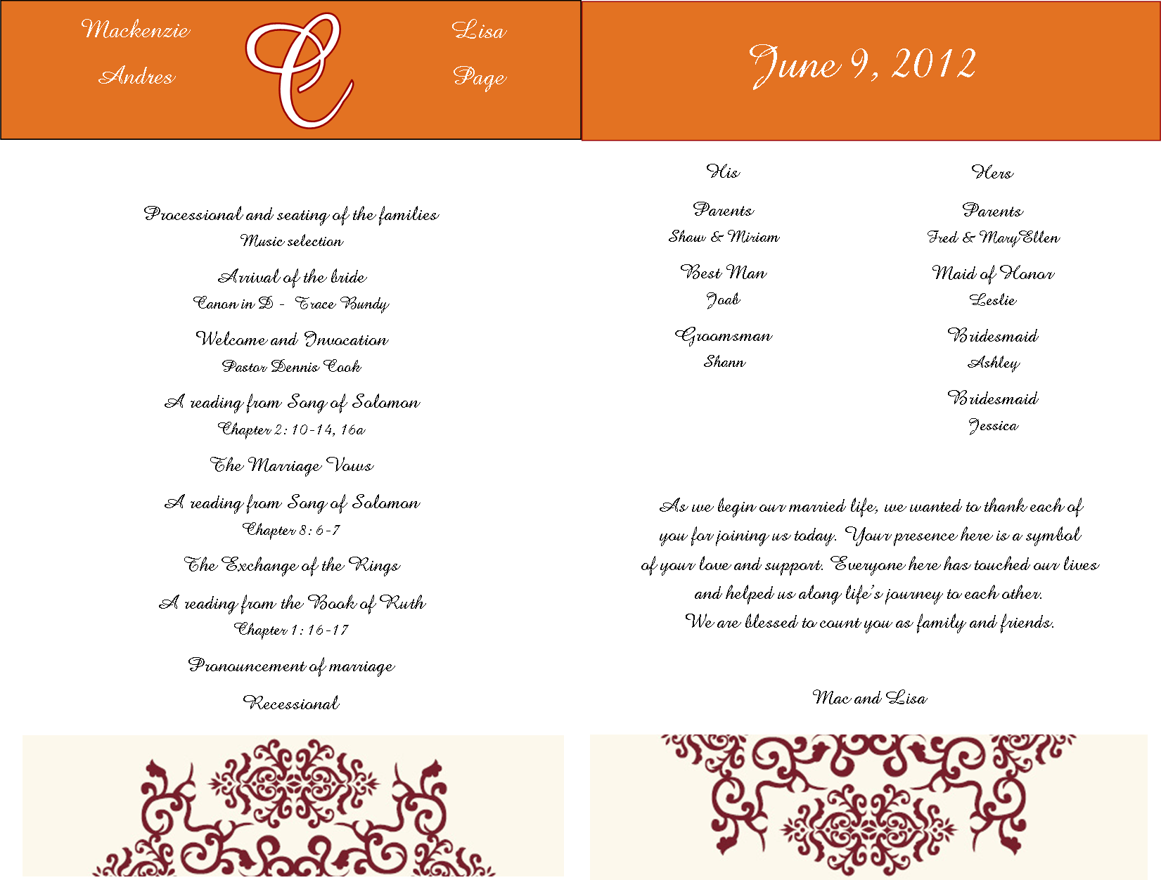 I first designed our wedding programs months ago while playing around in Microsoft Publisher (and later bought it for my personal computer). Wedding program fans seemed kind of necessary because of the heat, but I wanted a certain degree of continuity with the invites. My original designs included the damask pattern from the invitations. The damask moved from the sides to the top and bottom allowed for bigger and easier to read font.