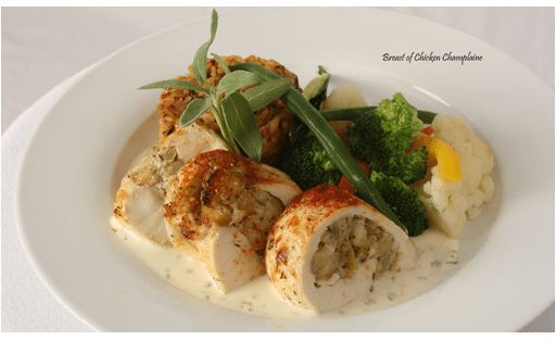 Entrees: chicken roulade with sage stuffing & Salisbury steak with mushrooms and Madeira